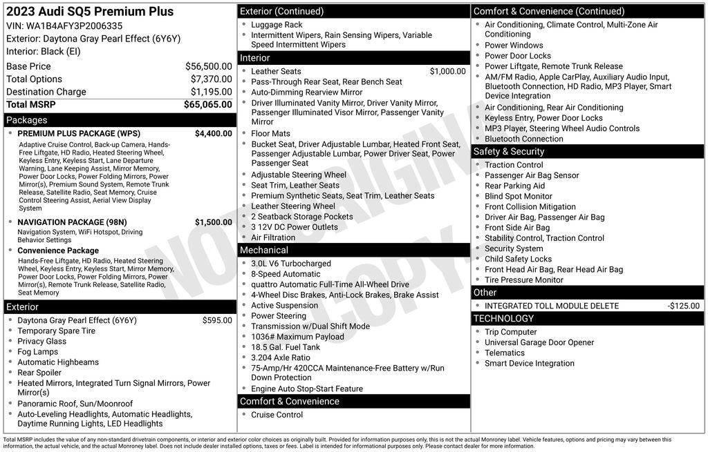 Convenience Package (Audi Advanced Key, Auto-Dimming Power Folding Exterior Mirrors, Driver Seat Memory, Heated Steering Wheel, and SiriusXM w/360L), Fine Nappa Leather Seats (Fine Nappa Leather Seating Surfaces), Navigation Package (Radio: MMI Navigation Plus), Premium Plus Package (Audi Active Lane Assist, Audi Virtual Cockpit Plus, Bang & Olufsen 3D Sound System, Hands-On Detection Steering Wheel, Leatherette Covered Center Console, Panoramic Sunroof, Top View Camera System, and Traffic Jam Assist), 10 Speakers, 3.204 Axle Ratio, 4-Wheel Disc Brakes, ABS brakes, Adaptive suspension, Air Conditioning, Alloy wheels, AM/FM radio, AM/FM Stereo, Auto High-beam Headlights, Auto-dimming Rear-View mirror, Automatic temperature control, Brake assist, Bumpers: body-color, Compass, Delay-off headlights, Driver door bin, Driver vanity mirror, Dual front impact airbags, Dual front side impact airbags, Electronic Stability Control, Emergency communication system: Audi connect CARE, Exterior Parking Camera Rear, Four wheel independent suspension, Front anti-roll bar, Front Bucket Seats, Front Center Armrest, Front dual zone A/C, Front fog lights, Front reading lights, Garage door transmitter: HomeLink, Heated door mirrors, Heated front seats, Heated Front Sport Seats, Illuminated entry, Integrated Toll Module Delete (DISC), Leather Shift Knob, Leather/Dinamica Seating Surfaces, Low tire pressure warning, Occupant sensing airbag, Outside temperature display, Overhead airbag, Overhead console, Panic alarm, Passenger door bin, Passenger vanity mirror, Power door mirrors, Power driver seat, Power Liftgate, Power passenger seat, Power steering, Power windows, Radio data system, Rain sensing wipers, Rear air conditioning, Rear anti-roll bar, Rear fog lights, Rear reading lights, Rear seat center armrest, Rear window defroster, Rear window wiper, Remote keyless entry, Roof rack, Security system, Speed control, Speed-sensing steering, Speed-Sensitive Wipers, Split folding rear seat, Spoiler, Sport steering wheel, Steering wheel mounted audio controls, Tachometer, Telescoping steering wheel, Tilt steering wheel, Traction control, Trip computer, Turn signal indicator mirrors, Variably intermittent wipers, and Wheels: 20" 10-Spoke-Star Design.