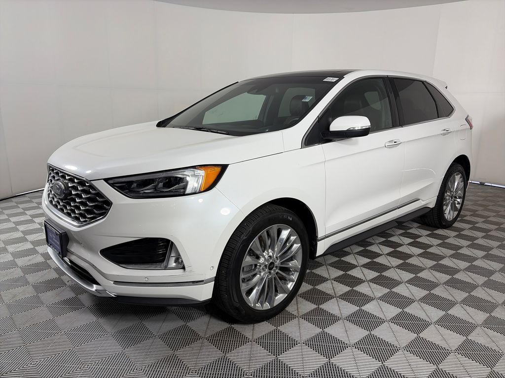 EQUIPMENT GROUP 301A Evasive Steering Assist, Adaptive Cruise Control w/Stop & Go, Adaptive LED Headlamps, LED amber light blade turn signals, Front 180-Degree Camera w/Split View & Washer, Heated Rear Seats, Lane Centering, Auto-Dimming Drivers Sideview Mirror, Enhanced Active Park Assist, parallel park, park out assist, reverse perpendicular parking, forward and reverse and side sensing systems, Panoramic Vista Roof, Deletes standard silver roof-rack side rails, power open/close w/power shade, Standard 2nd row LED dome light is replaced w/2 single lights, Switch located in each grab handle pocket, Voice-Activated Touchscreen Navigation System, pinch-to-zoom capability, SiriusXM Traffic & Travel Link, a, Services are not available in Alaska and Hawaii, TITANIUM ELITE PACKAGE painted body color front bumper w/bright chrome inserts, painted body color rear bumper, body color lower side cladding w/bright chrome inserts and ebony w/brunello perforated inserts seat color, Front & Rear Floor Mats, brick red embroidered Edge logo (front only) and accent stitching, Wheels: 20 Polished Aluminum, Tires: 245/50R20 AS, Intrecciato Bright Alum Instrument Panel Appliques, Bright Chrome Accents & Surround Upper Grille, Brunello w/Brick Red Accent Stitching Door Inserts, CARGO ACCESSORY PACKAGE Custom accessory, pre-installed, Retractable Cargo Area Cover, Cargo Mat, Rear Bumper Protector, WHEEL-LOCKING LUG NUTS (DEALER INSTALLED), ENGINE: TWIN-SCROLL 2.0L ECOBOOST auto start-stop technology (STD). Ford Titanium with Star White Metallic Tri-Coat exterior and Ebony interior features a 4 Cylinder Engine with 250 HP at 5550 RPM*.