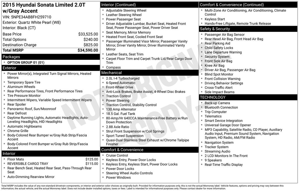 Option Group 01, Black Leather, 18" Unique Alloy Wheels, 4-Wheel Disc Brakes, 9 Speakers, ABS brakes, Air Conditioning, Alloy wheels, AM/FM radio: SiriusXM, Android Auto, Anti-whiplash front head restraints, Auto High-beam Headlights, Auto-dimming Rear-View mirror, Automatic temperature control, Brake assist, Bumpers: body-color, Carpeted Floor Mats, CD player, Compass, Delay-off headlights, Driver door bin, Driver vanity mirror, Dual front impact airbags, Dual front side impact airbags, Electronic Stability Control, Emergency communication system: Blue Link, Exterior Parking Camera Rear, Four wheel independent suspension, Front anti-roll bar, Front Bucket Seats, Front Center Armrest, Front dual zone A/C, Front reading lights, Fully automatic headlights, Garage door transmitter: HomeLink, Heated door mirrors, Heated front seats, Heated rear seats, Heated/Ventilated Front Bucket Seats, High-Intensity Discharge Headlights, Illuminated entry, Knee airbag, Leather Seating Surfaces w/Contrast Stitching, Leather Shift Knob, Leather steering wheel, Low tire pressure warning, Memory seat, Navigation System, Occupant sensing airbag, Outside temperature display, Overhead airbag, Overhead console, Panic alarm, Passenger door bin, Passenger vanity mirror, Power door mirrors, Power driver seat, Power moonroof, Power passenger seat, Power steering, Power windows, Radio data system, Radio: AM/FM/SiriusXM/CD/MP3 w/Navigation, Rear anti-roll bar, Rear Parking Sensors, Rear reading lights, Rear seat center armrest, Rear window defroster, Remote keyless entry, Reversible Cargo Tray, Security system, Speed control, Speed-sensing steering, Speed-Sensitive Wipers, Split folding rear seat, Spoiler, Steering wheel mounted audio controls, Tachometer, Telescoping steering wheel, Tilt steering wheel, Traction control, Trip computer, Turn signal indicator mirrors, Variably intermittent wipers, and Ventilated front seats.