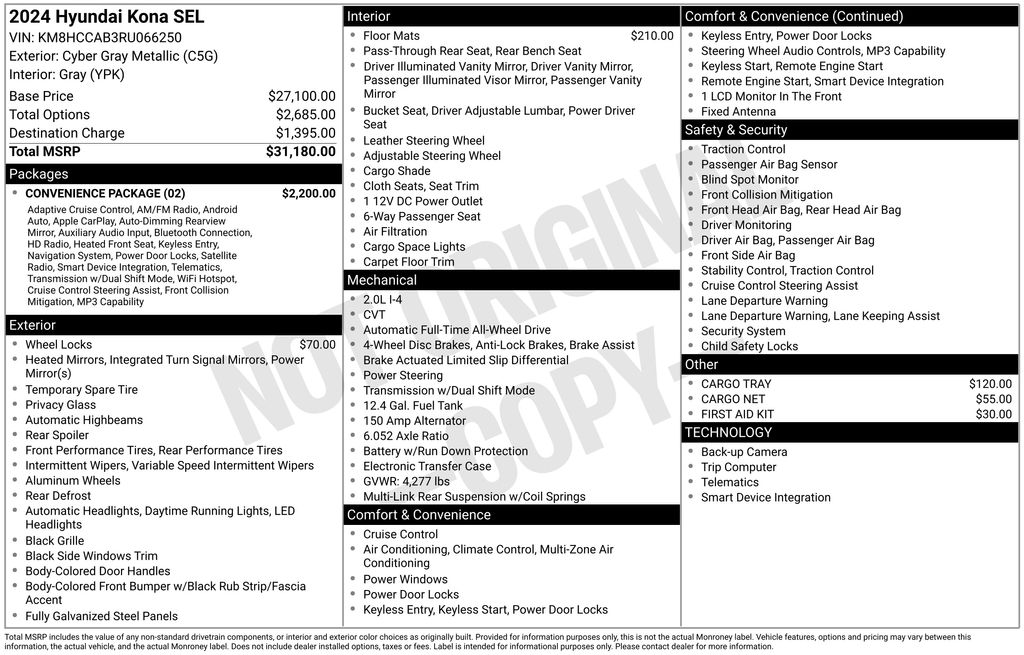 Cyber Gray Metallic 2024 Hyundai Kona SEL AWD CVT 2.0L I4 DOHC 16V 27/29 City/Highway MPG