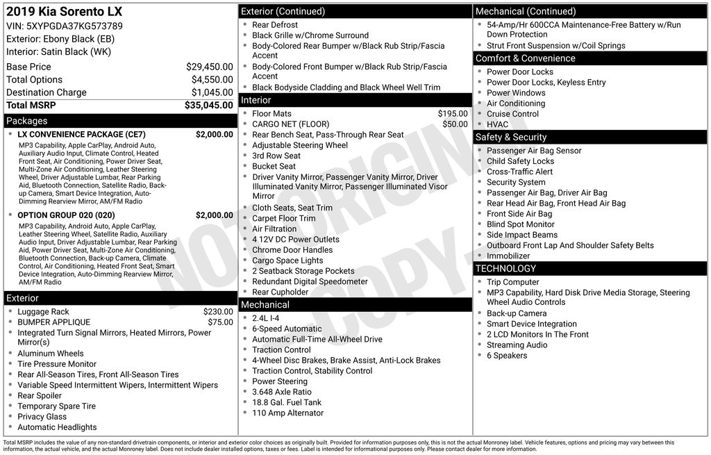Ebony Black 2019 Kia Sorento LX AWD 6-Speed Automatic with Sportmatic I4 21/26 City/Highway MPG