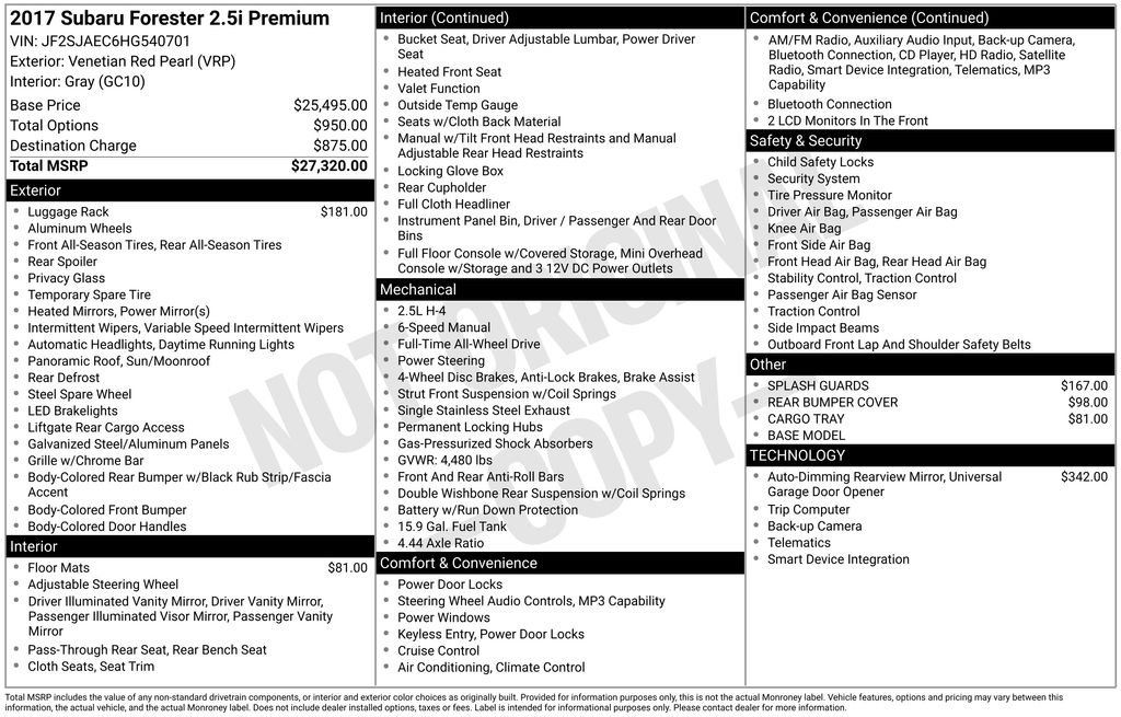 Venetian Red Pearl 2017 Subaru Forester 2.5i Premium AWD 6-Speed Manual 2.5L 4-Cylinder DOHC 16V VVT 22/28 City/Highway MPG